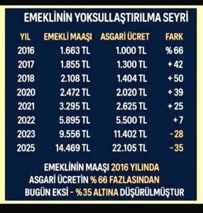 2016 yılında asgari ücretten % 66 daha fazla maaş alan bir emekli buğün asgari ücretin yüzde 24 altına düştü.